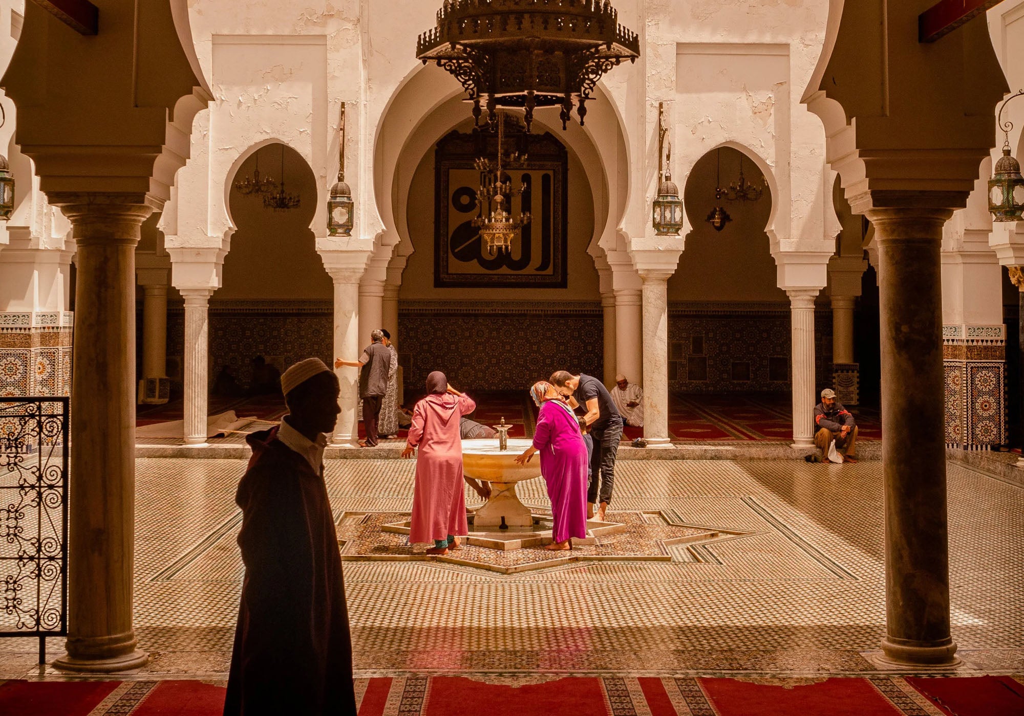 Enter Fes on foot to walk its vast pedestrian medina, passing Andalusian detail, Kufic calligraphy, and the enduring presence of the grand 9th-century University of Al-Karaouine.