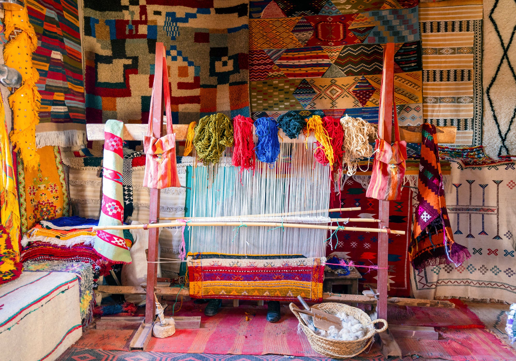 Handwoven Berber rugs carry the language of the High Atlas in wool and dye: bold geometry, protective motifs, colours pulled from mineral soils, saffron, and indigo. Metal trays catch the sun, leather hangs softening with use, and sellers greet passers-by with the easy familiarity of a place shaped by trade. This is not a showroom but a working souk, where objects are made to travel, to be used, and to last. Time here sharpens your eye for regional craft and the quiet confidence of goods created for daily life.