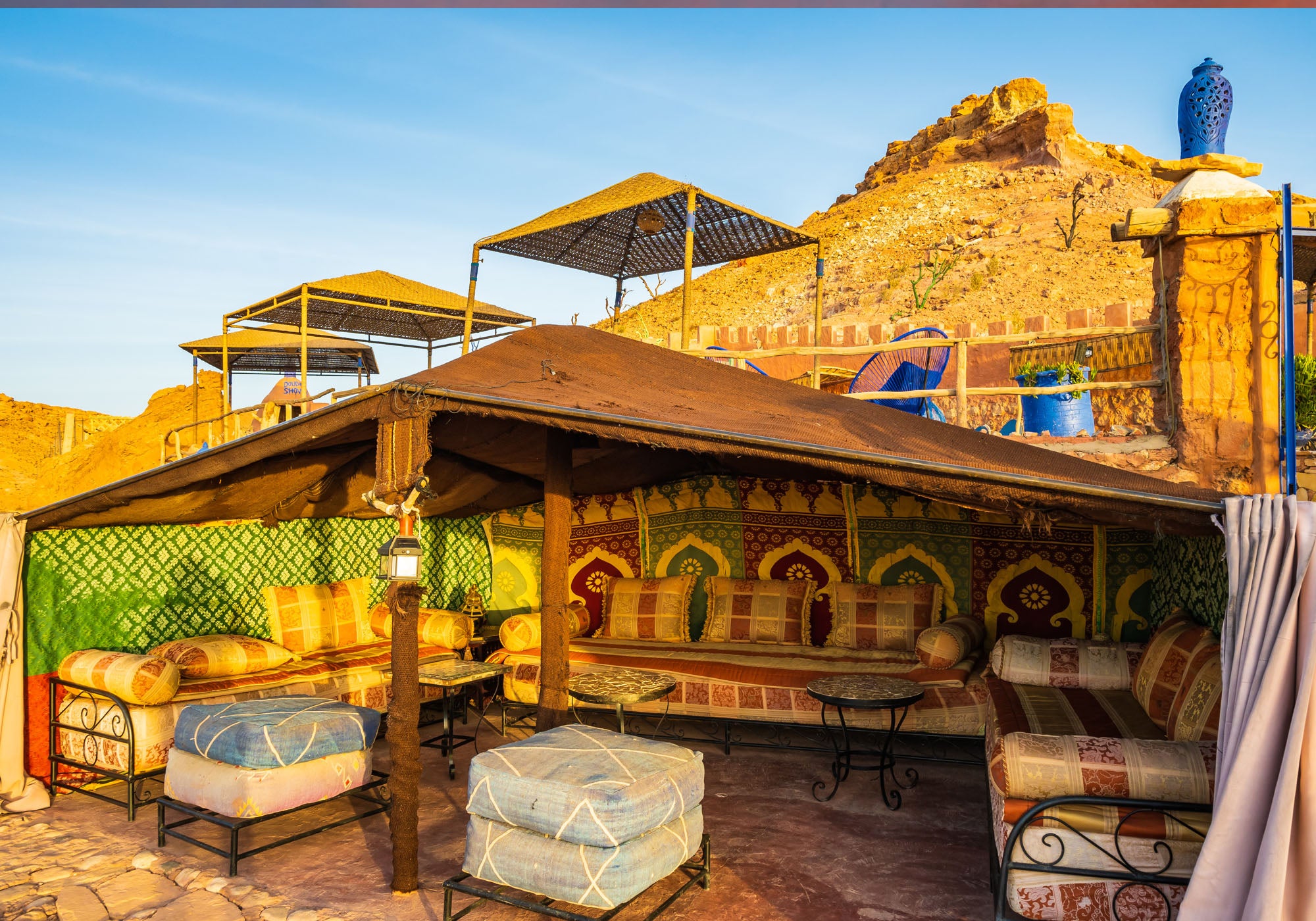 Beneath bright, blue skies you’ll take a break in a traditional Moroccan tent, where you can plan a scenic hike, relax with mint tea, or, explore in the shade of the Ksar, with its steps, alleys, and tiny galleries.