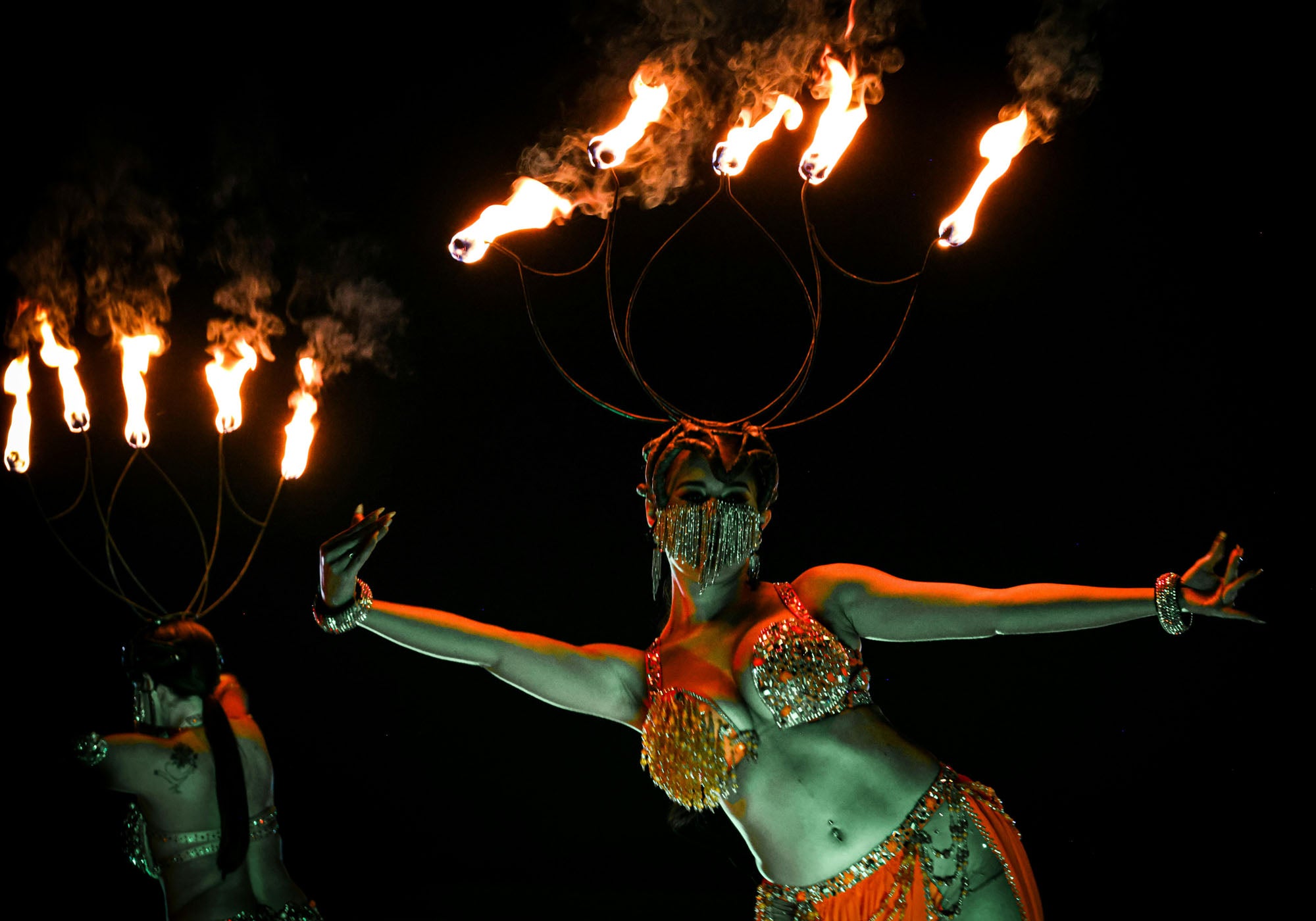 Soon, the steady, metallic beat of krakebs fills the canyon, grounding the soaring melodies of Gnaoua dancers whose movements trace ancient stories into the sand. The energy peaks as fire dancers emerge, their flaming arcs cutting through the darkness to mirror the stars above. It is a sensory takeover—a vivid, fire-lit celebration that proves the desert is at its most alive just as the world goes dark.