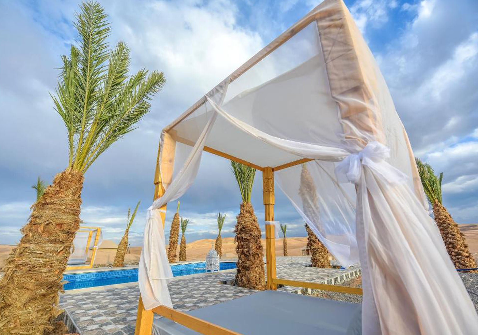 From the vantage of a tiled pool deck, watch the Atlas Mountains silhouette against a sky untouched by the modern world.