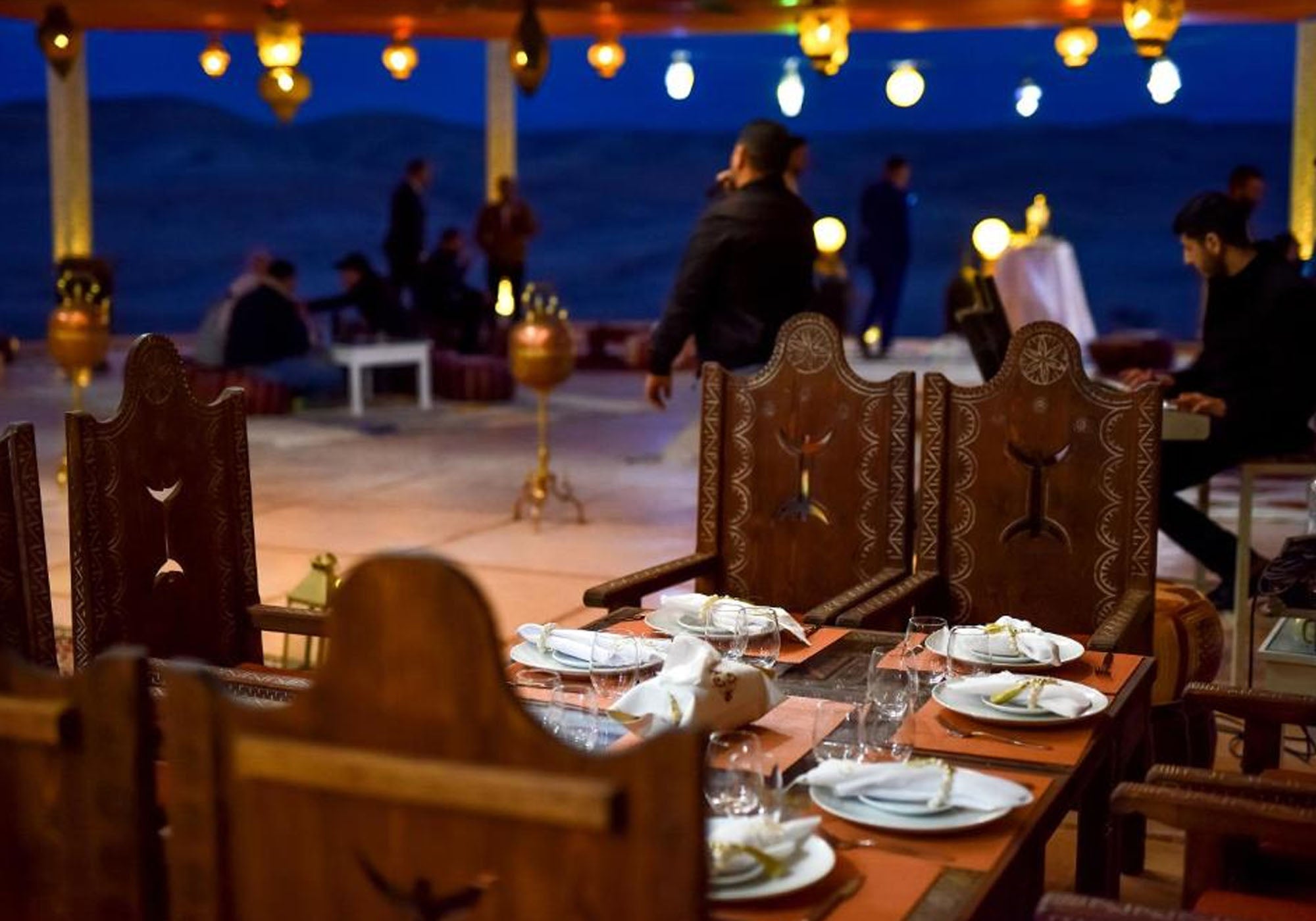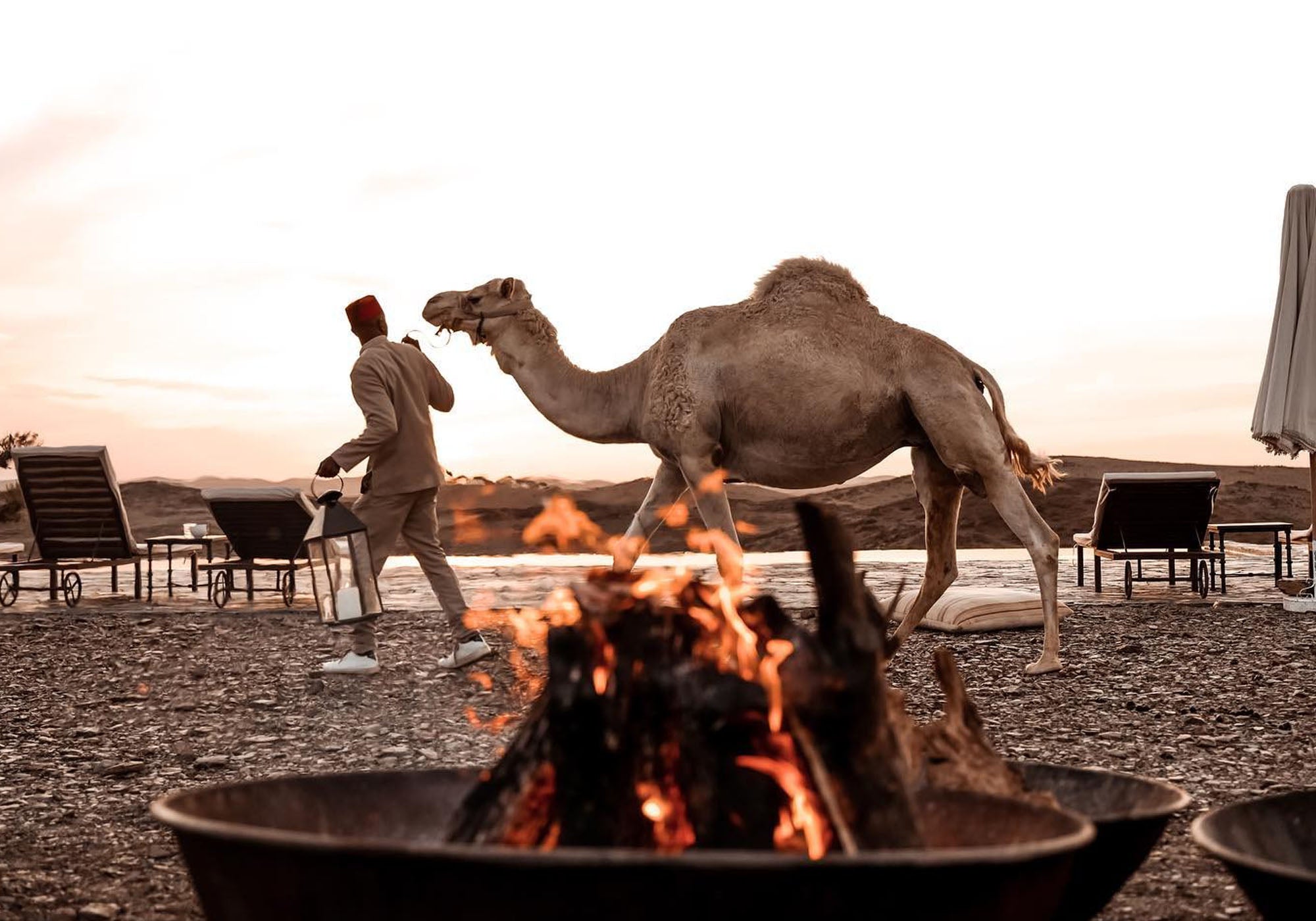 As the horizon bleeds into deep indigo, the quiet is intentionally broken. The air begins to thicken with the scent of woodsmoke as the evening bonfire is lit, its amber glow dancing across the faces of Berber musicians.