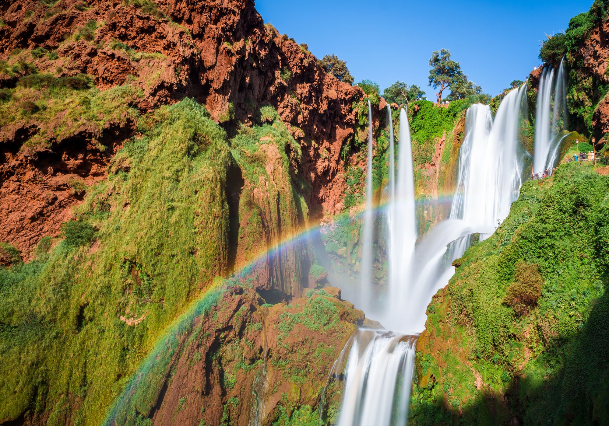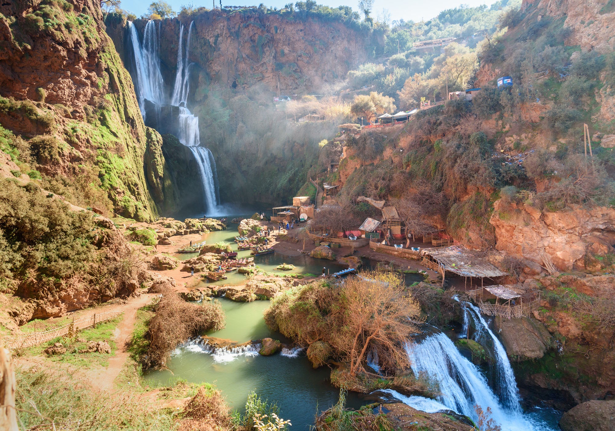 Swap the rocky terrain for the lush greenery of the Ouzoud Falls, the highest waterfalls in North Africa.