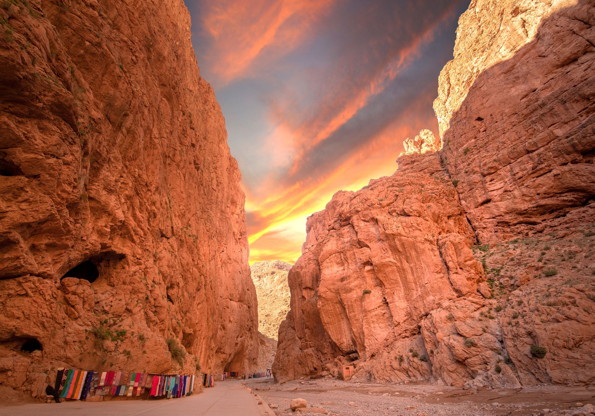 Next is the Todra Gorge, a spectacular limestone trench that narrows to just 10 meters wide while the walls soar 300 meters skyward.