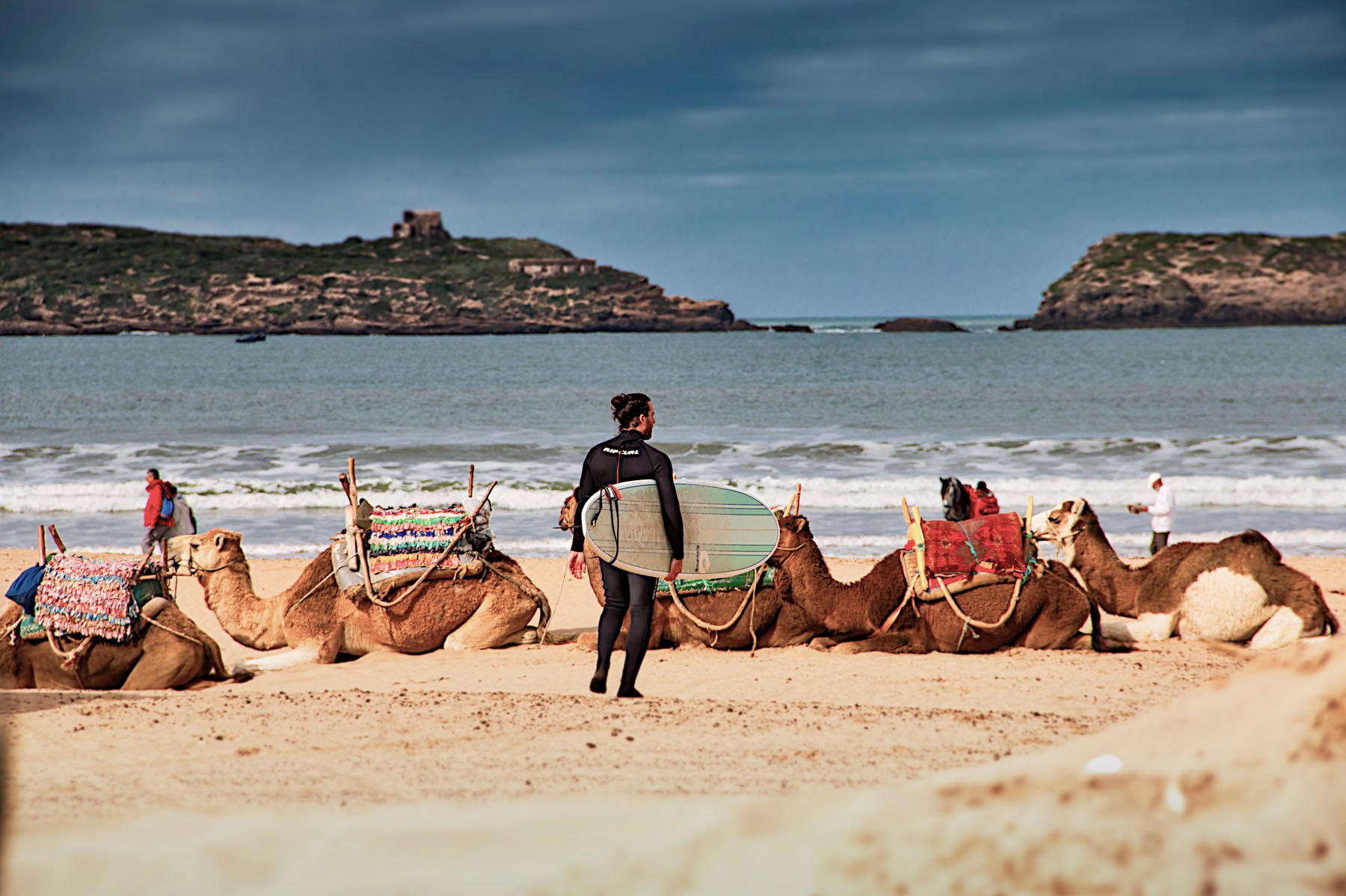 Camels are led along the water by blue-clad Berbers while kitesurfers and paddleboarders work the wind just beyond the break. A man passes with a tray of doughnuts balanced on his head, weaving between bare feet, boots, bikinis, and full-length abayas. The Atlantic roars through it all, unconcerned with who’s watching.