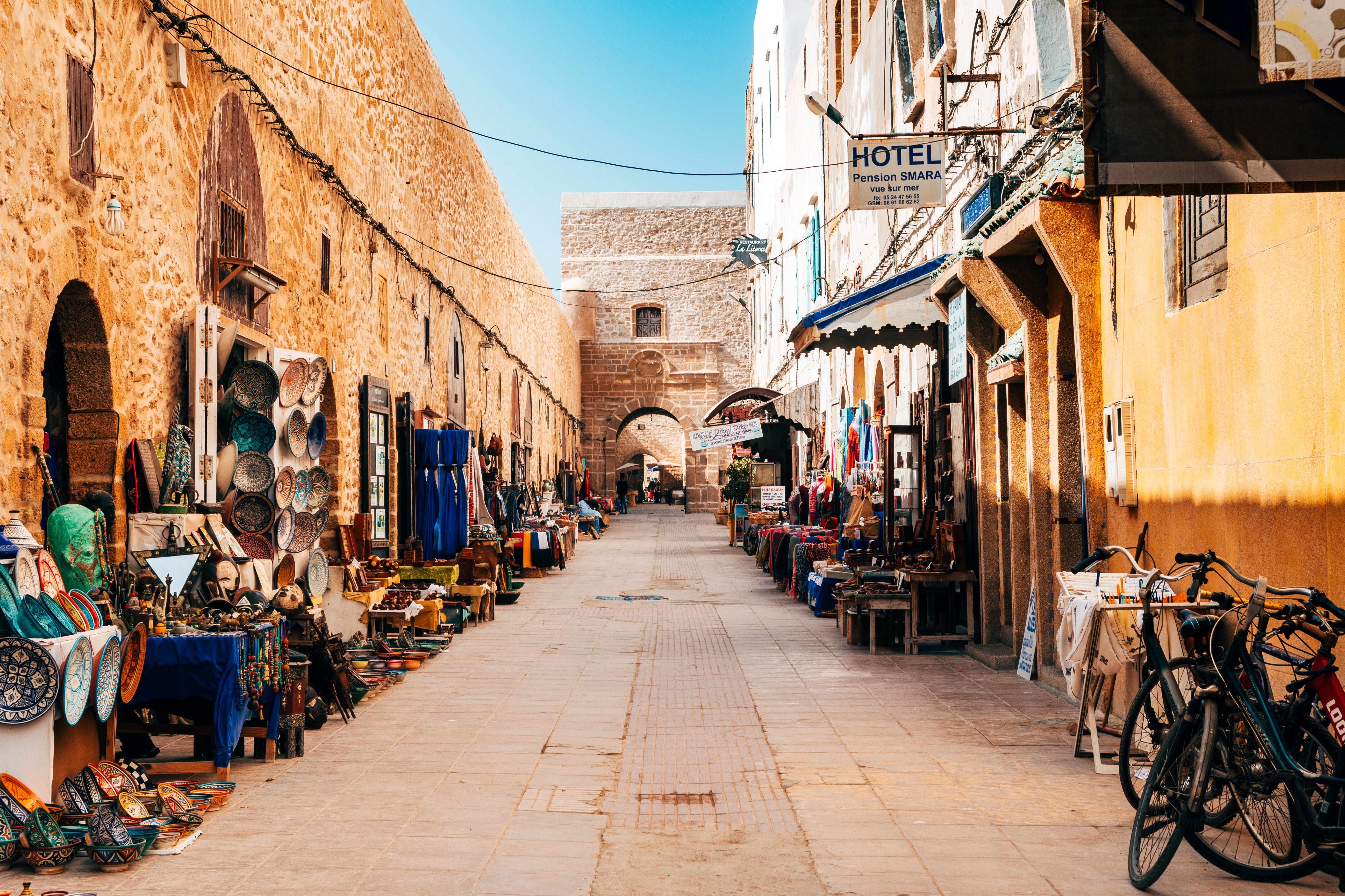 Salt wind moves through the Skala before you do. Cannons line the stone edge, Atlantic water breaking hard below, spray lifting into the light. Walk the length of the walls where Mogador once faced the world — blue fishing boats stacked in the harbour, gulls cutting low, carpenters hammering hulls just beyond the gate.