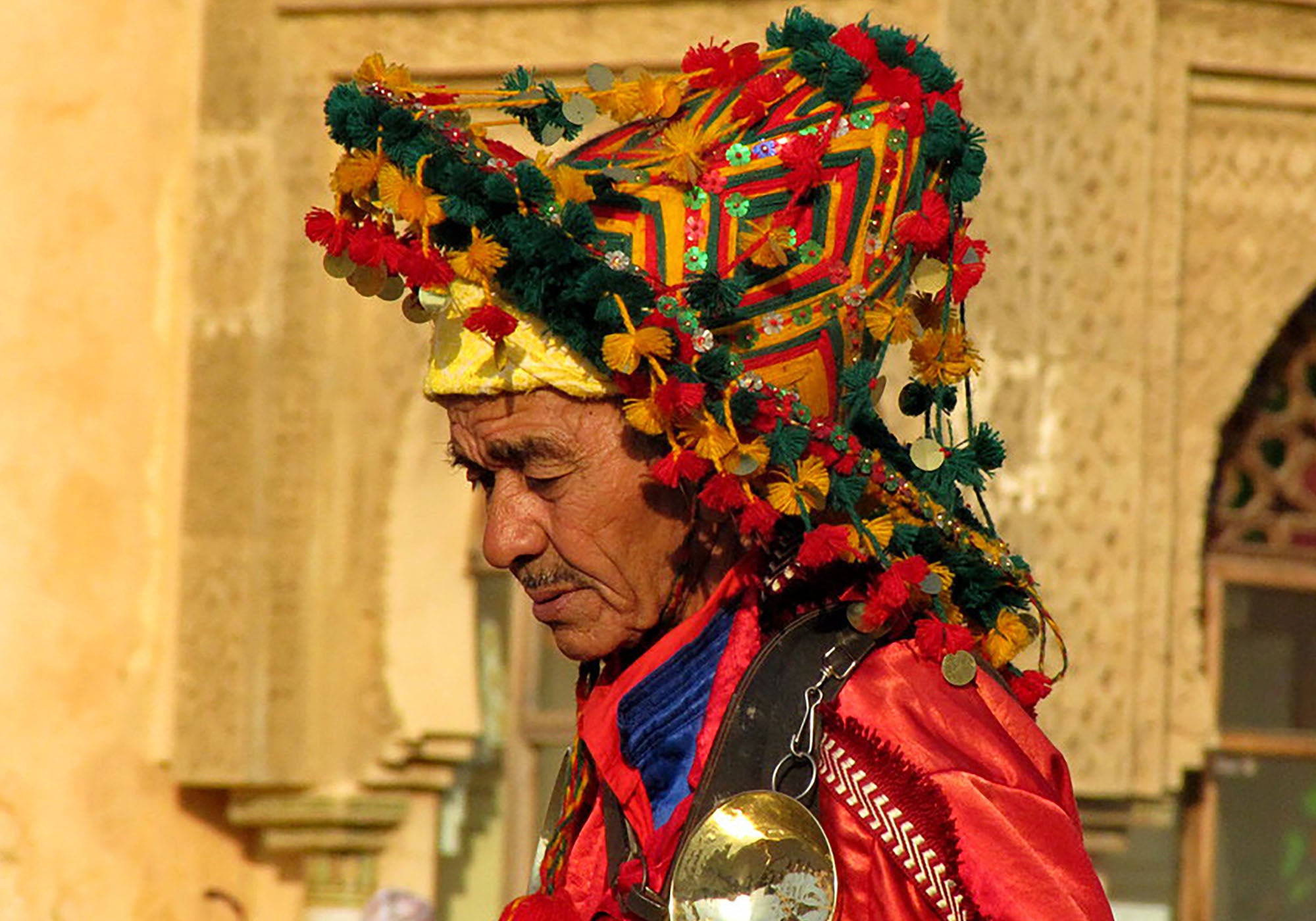 Beneath the ancient gates, a brightly-clad Berber drummer adjusts his tasselled straw taraza, brass bells gleaming as he prepares to sound his darbuka.