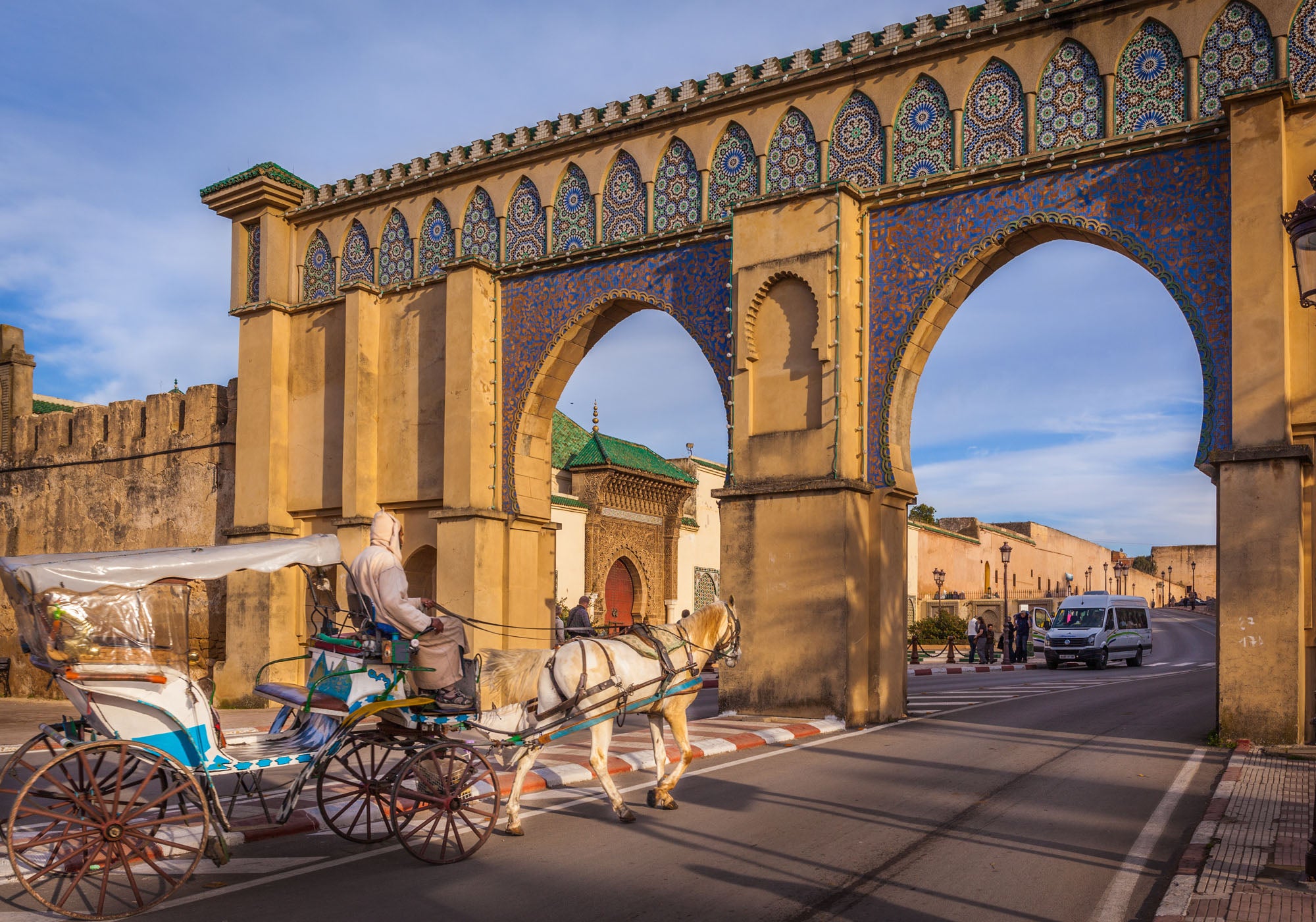 A horse-drawn carriage moves over cobbled ground beneath Bab Mansour, following a route once shared by royals, traders, and anyone else with reason to pass through.