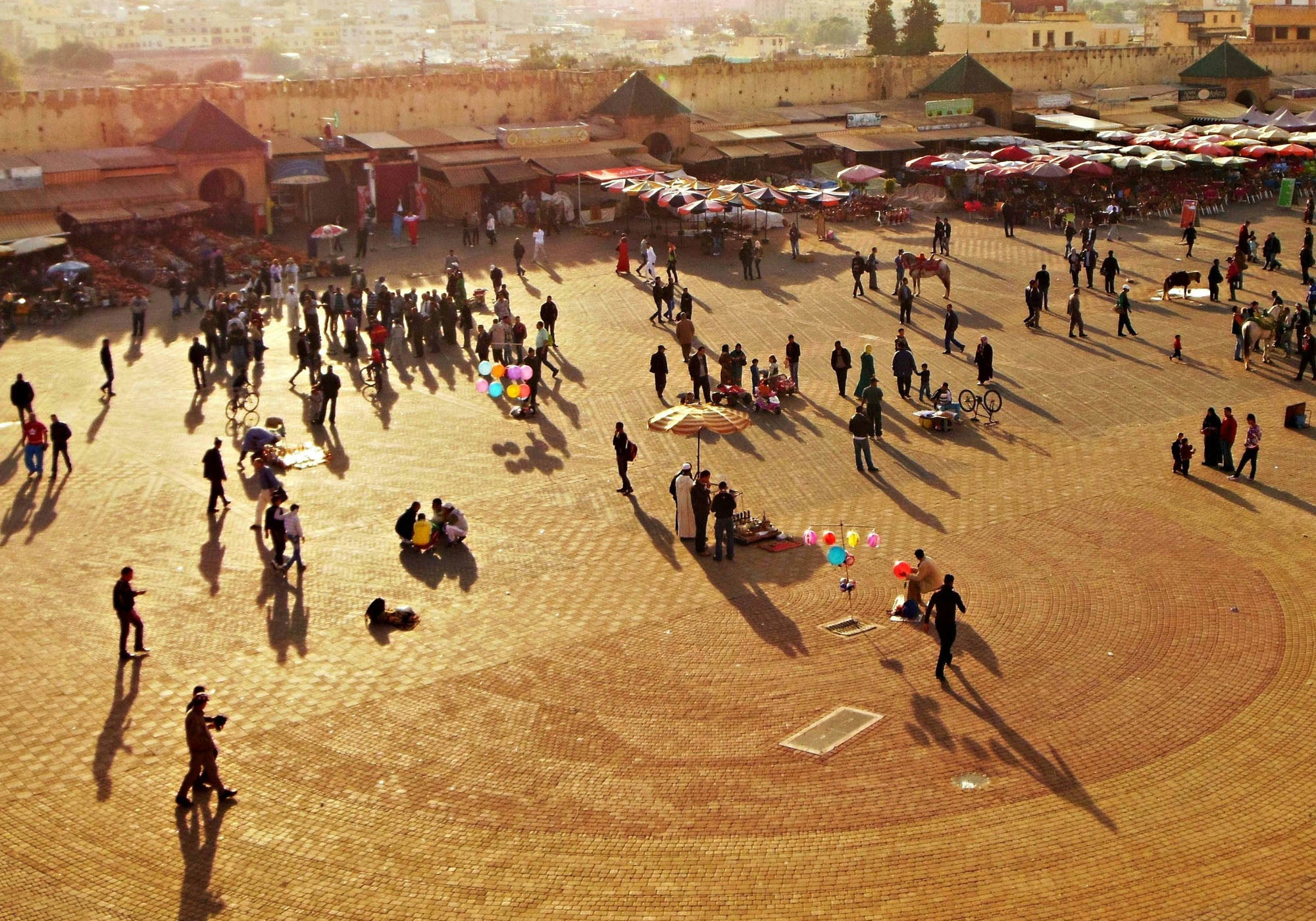 Vendors arrive with carts and folded blankets, balloons lift above the crowd, and loose circles form and dissolve as conversations take hold, drift, and regroup. The square is built for gathering, its scale giving space to the city’s daily business and gossip as they play out in the open. Pause at the perimeter and watch the patterns emerge: families cutting across on familiar paths, buyers and sellers mid-negotiation, teenagers climbing walls and testing boundaries. This is Meknes in full view, using its largest civic space exactly as it has always done.