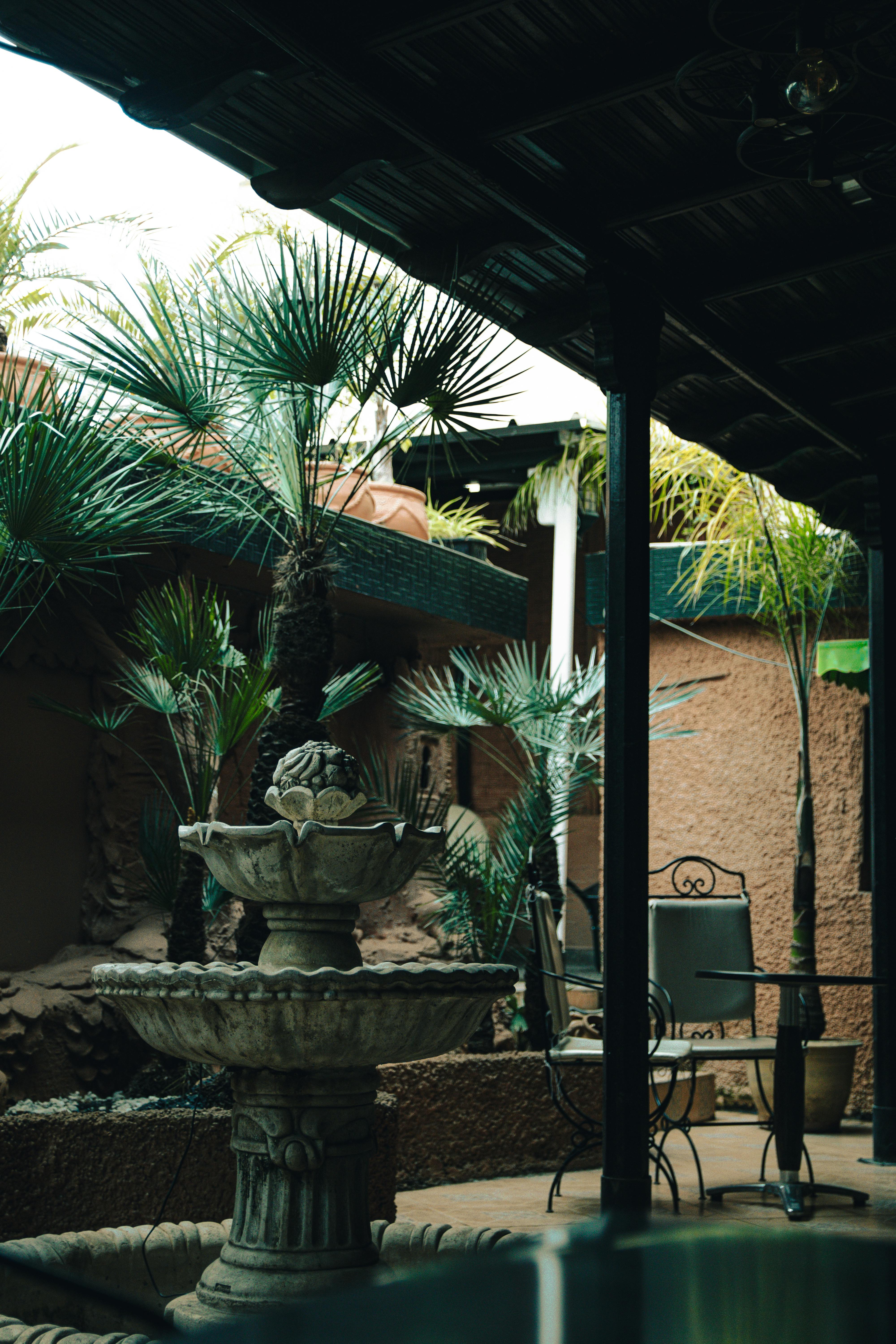 The open ceiling in this tiled courtyard lets shafts of sunlight fall across patterned zellij and carved columns.
