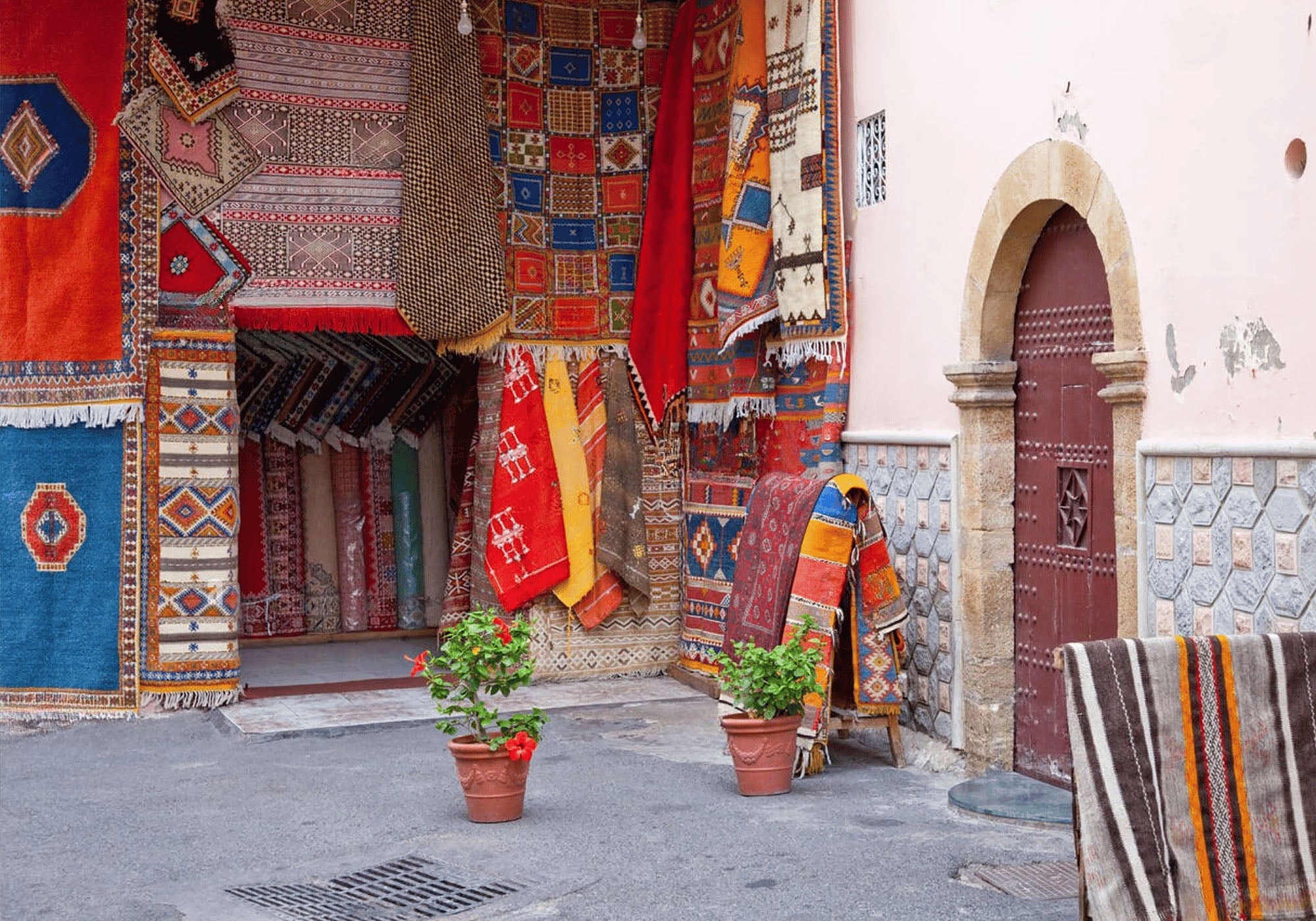 Each hand-woven carpet carries the mark of its Amazigh artisan: a hand-stitched motif, a secret emblem, a narrative in thread. You pause to trace a geometric design, feel the wool still warm from the loom, and notice the small imperfections that make every piece unique. Shadows catch the folds, dancing across the cobbles. Beyond the textiles, a child runs through an open door, the pulse of daily life continuing beyond the vibrant display.